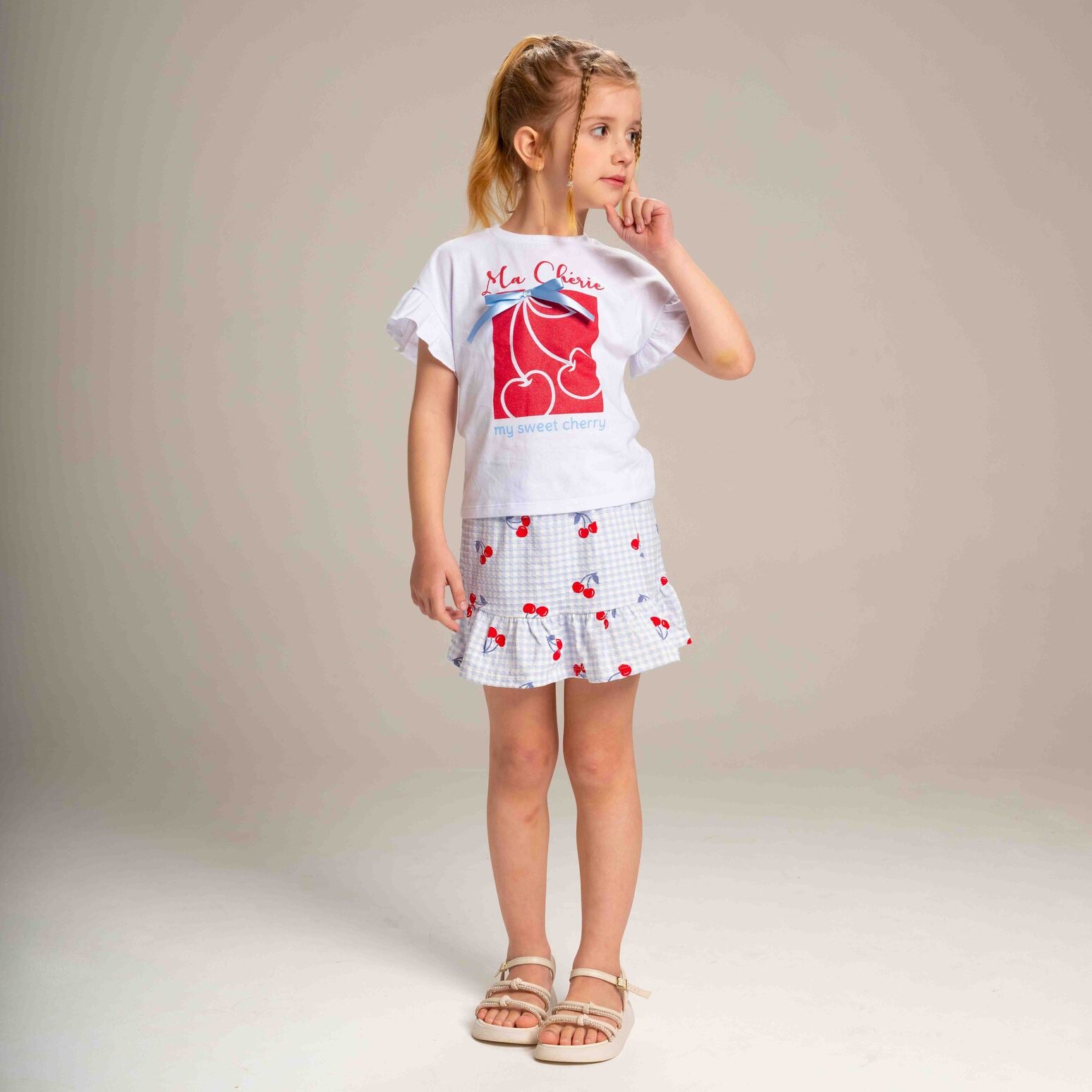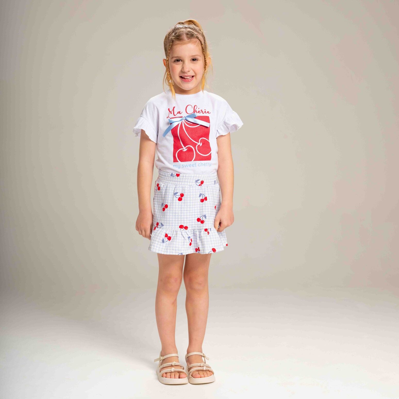 Para completar, o conjunto acompanha um shorts/saia com estampa rotativa de cerejinhas e fundo xadrez. O caimento é confortável, leve e perfeito para acompanhar as pequenas em todos os momentos.