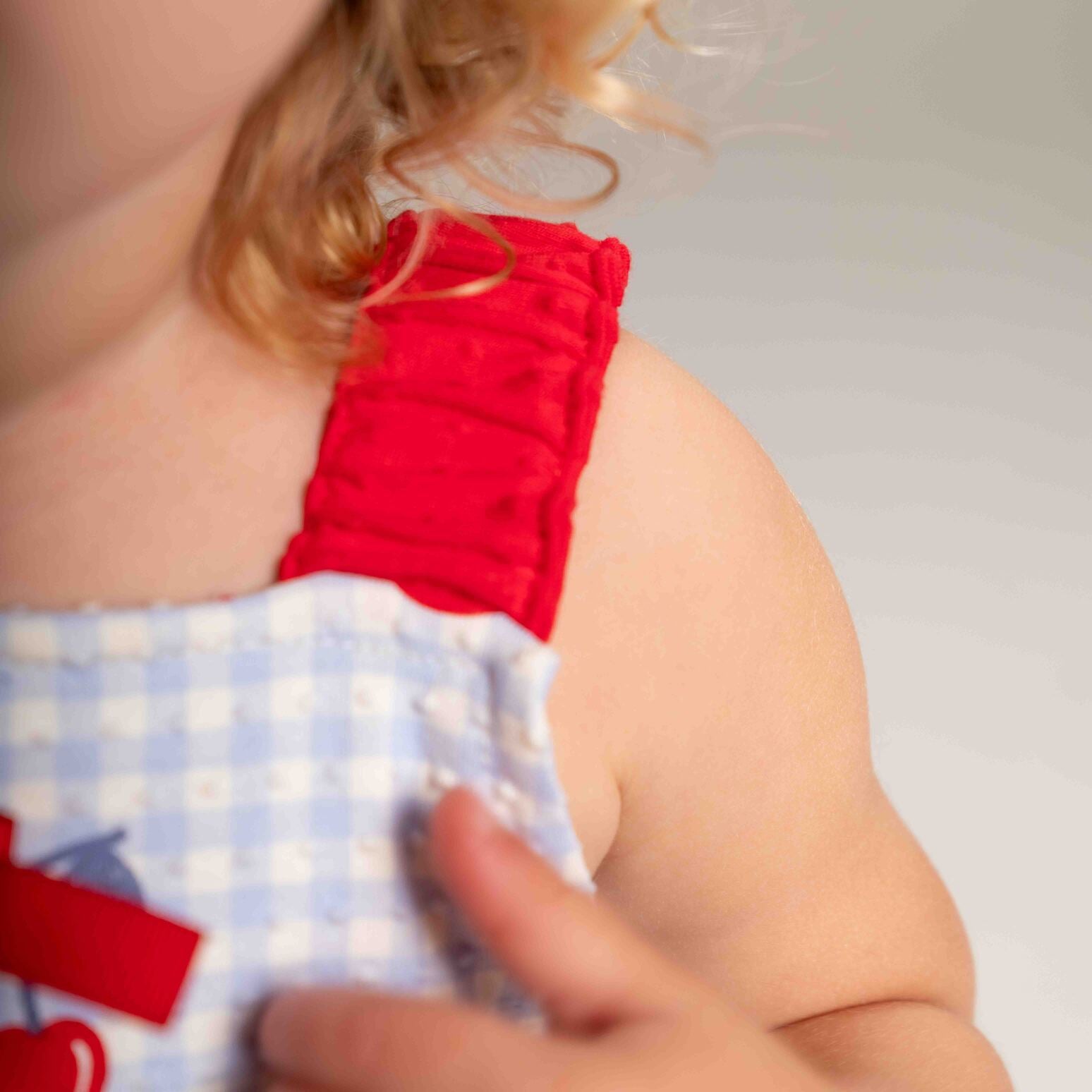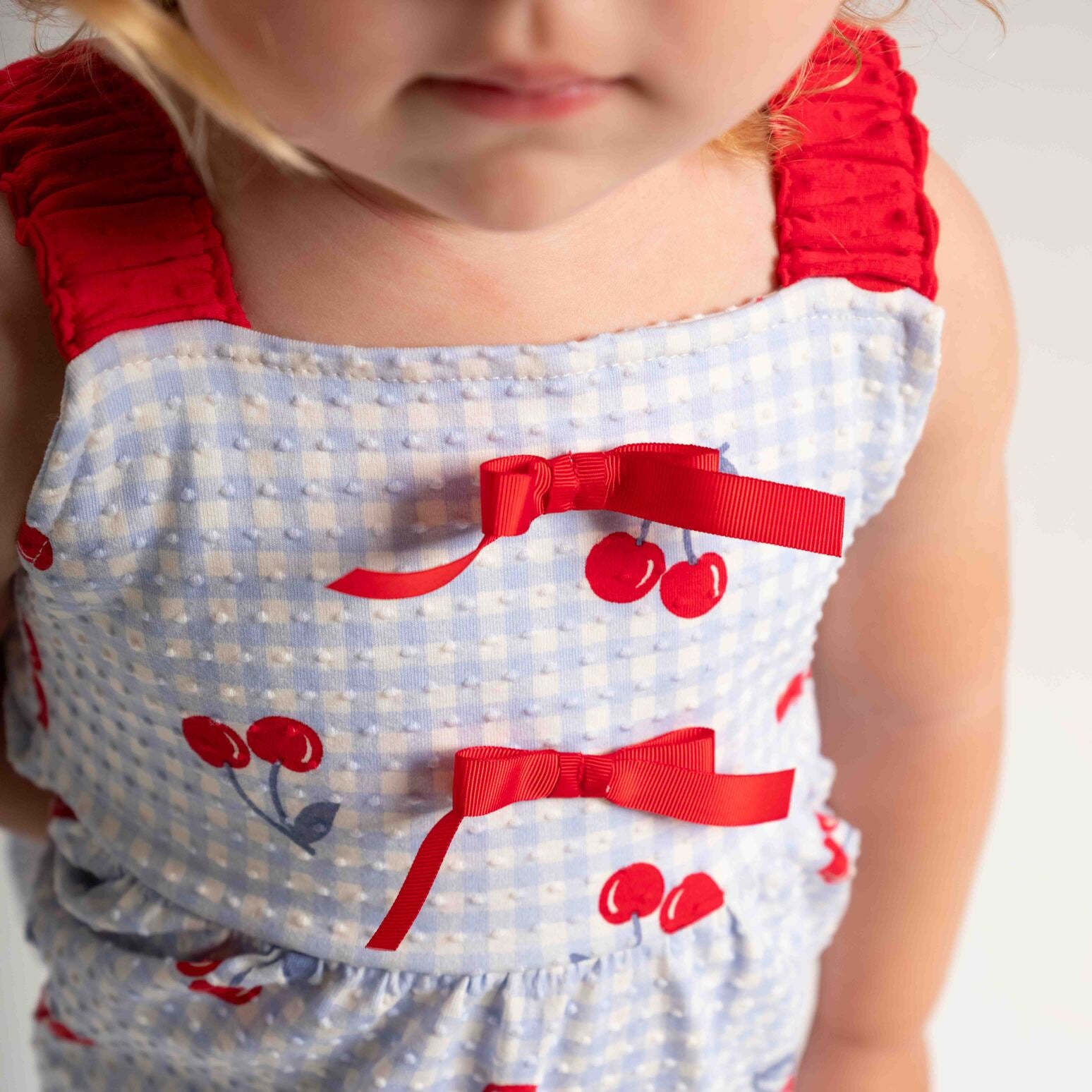 Confeccionado em cotton poá plic, ele combina conforto e leveza com uma estampa rotativa de cerejinhas e xadrez que deixa o look ainda mais encantador.